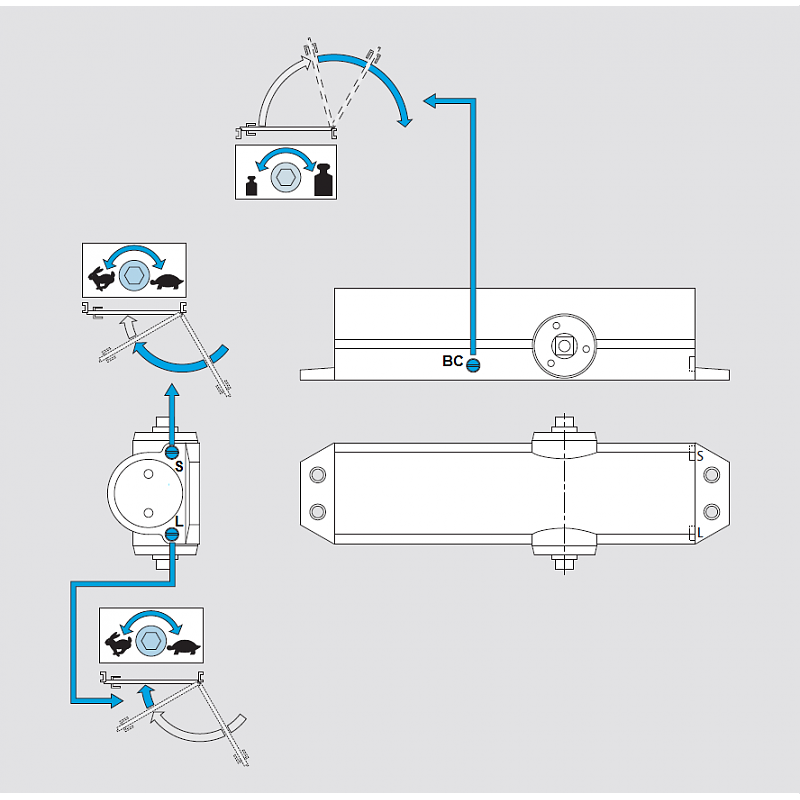 функция против вятър (back-check), регулирана от клапан, работа от 75°, - регулиране на скорост на затваряне и затваряне