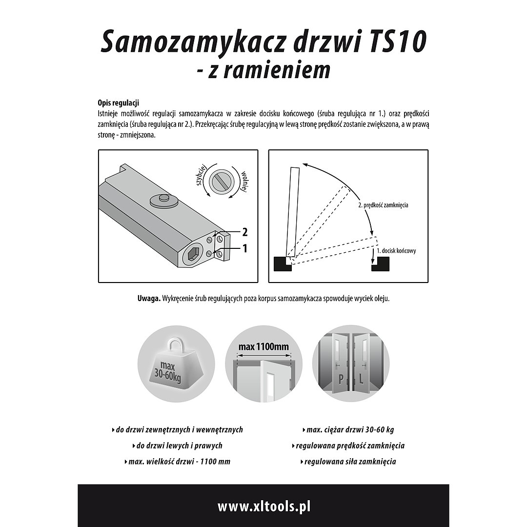затварящото устройство може да се монтира на врати с ширина 70 - 110 см и тегло 35-60 кг