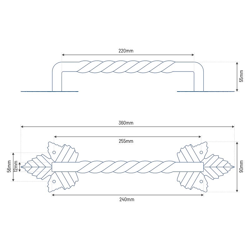 Дръжката KOVAL е метална дръжка, предназначена за монтаж на различни видове врати. Характеризира се с декоративен мотив кленов лист, който придава елегантност и уникалност. Цялата е покрита с черен прахов лак, което гарантира издръжливост и устойчивост на повреди. Дръжката е с дължина 210 мм, а цялата конструкция е 360 мм. Дръжката е здрава и стабилна, идеална за отваряне на врати, порти, портали, ракли, капаци и др.