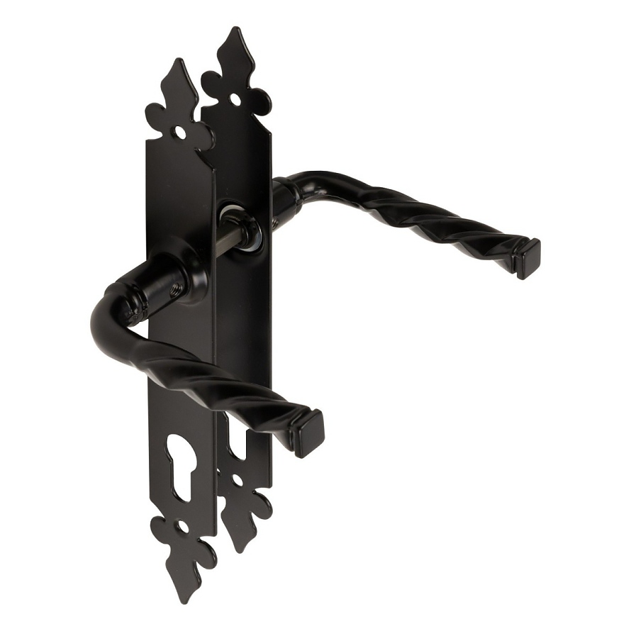Рустикална дръжка за врата с продълговата табела. Универсалният дизайн позволява употреба както в леви, така и в десни врати. Снабден с отвор, позволяващ монтиране на ключалка.