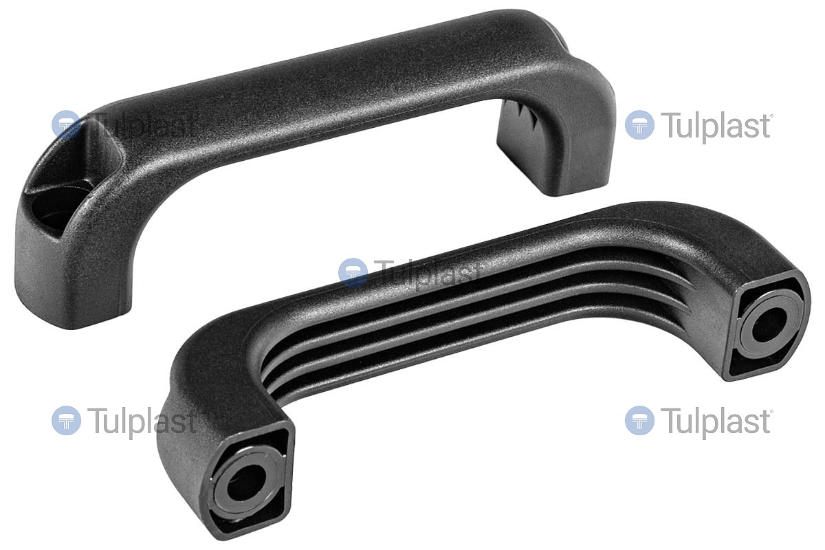 Дръжките се използват най-често като дръжки за носене или дръжки за отваряне на врати и капаци на машини или устройства. Предлаганите пластмасови дръжки са изработени от висококачествен полиамид. Дръжките се характеризират с висока устойчивост на външни фактори, устойчивост на механични повреди, устойчивост на греси, масла и различни препарати. Всички тези характеристики доказват, че нашите пластмасови дръжки могат да бъдат монтирани в индустриалния сектор. Интересен модел е пластмасова дръжка с проходни . Стандартната дръжка е черна
