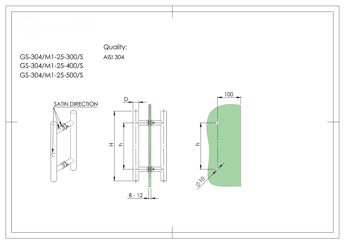 Материал: Неръждаема стомана AISI 304, Повърхностна обработка: Шлайфане, Стъкло t: 8-12, H: 400, h: 300, D: 25, Отвор в стъклото: Да