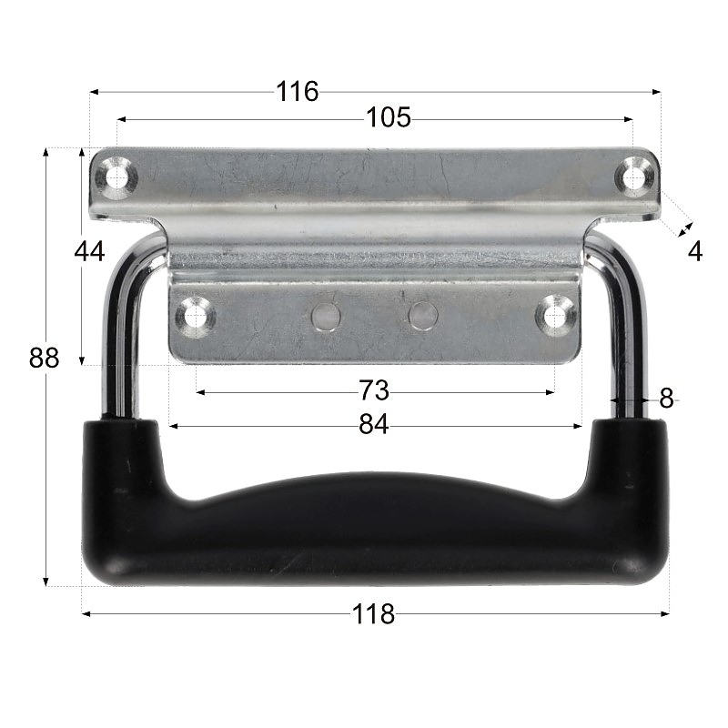 Размери: 116 x 84 x 8 мм, основа 44 x 116 мм, дебелина на листовата основа 1,7 мм, диаметър на телта на дръжката 8 мм