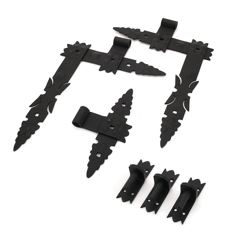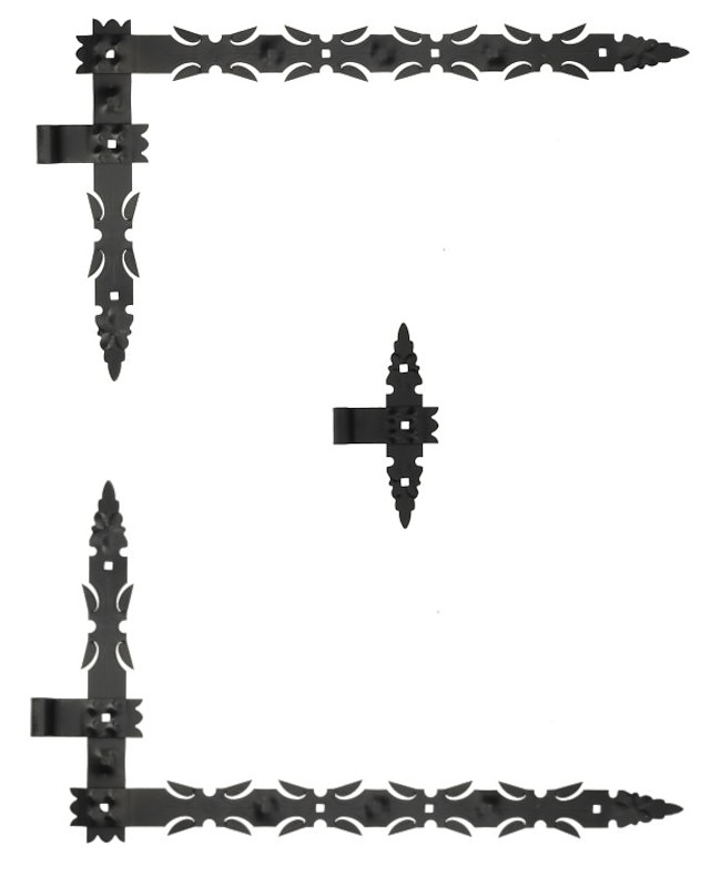 Кована ъглова панта JNS, комплект от 3 части, черна, 60x46x5 см, е комплект декоративни, ковани обкови, предназначени за дървени порти и врати. Комплектът включва две ъглови панти и една централна панта, оборудвани с монтажни щифтове. Продуктът е идеален за употреба в едно крило на дървена дограма. Пантите MetalKraft са боядисани в черно, което допълнително ги предпазва от повреди и корозия. Благодарение на своите орнаменти, тези панти се сливат перфектно с дървените конструкции, добавяйки им естетичен вид.