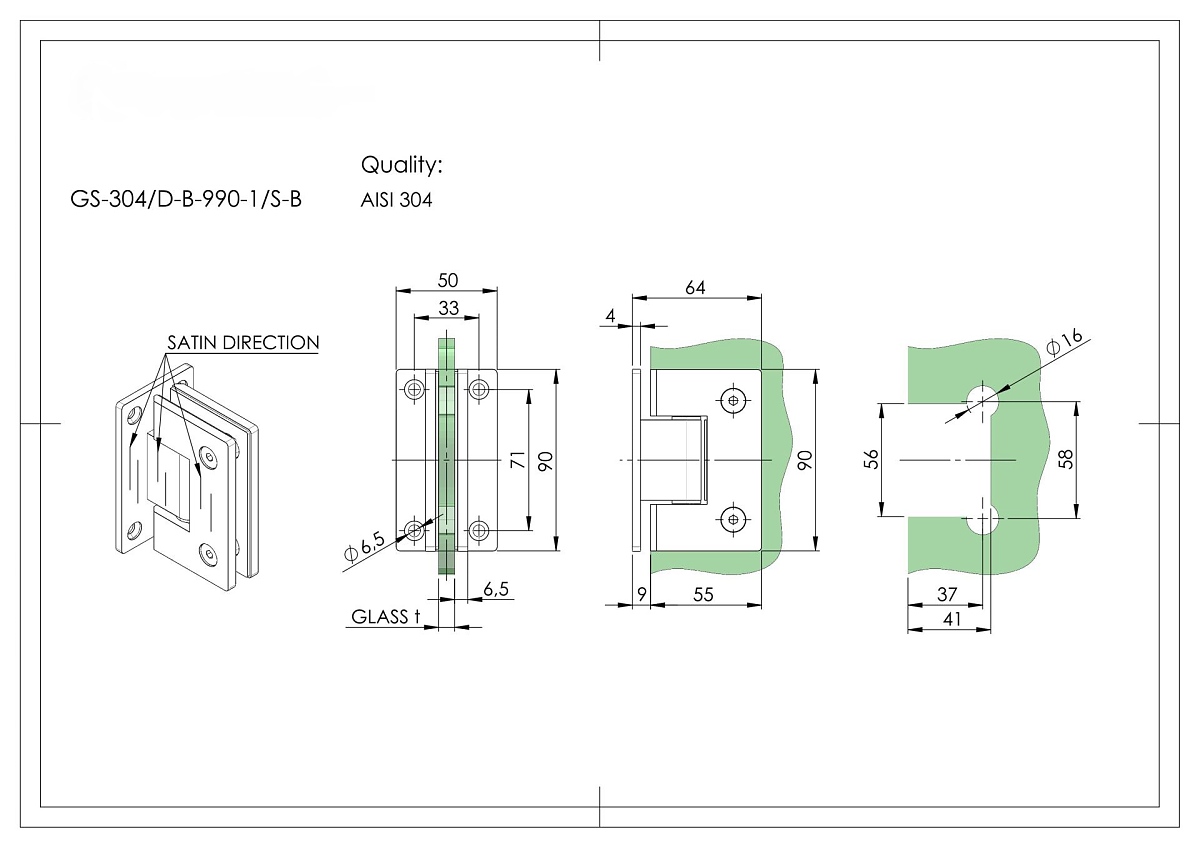 Материал: Неръждаема стомана AISI 304, Повърхност: Гланц, Стъкло t: 8, 10, Пълнеж: Стъкло, Gmax(kg)/2бр.: 45, Анкериране: На стена, Самозатваряща се функция: +-15°, Стоп функция : +-90 °/0°, В: 90, Ш: 55, Отвор в стъклото: Да