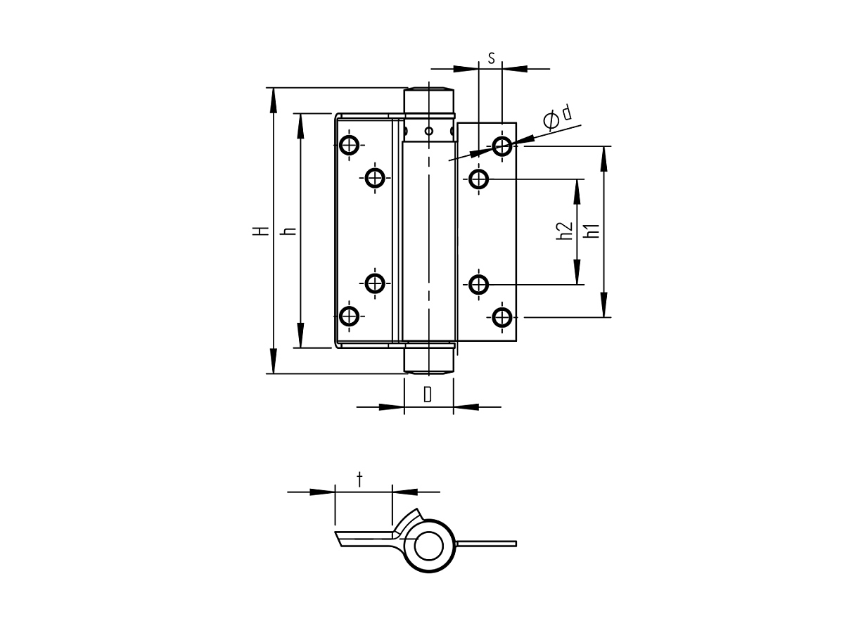Материал: Неръждаема стомана AISI 304, Повърхностно покритие: Сатинирано, Тегло на вратата Gmax/Goptimal (kg): 15, D: 18мм, d: 5,5мм, H: 93мм, h: 77мм, h1: 53мм, h2: 26мм, s: 6мм, t: 25мм
