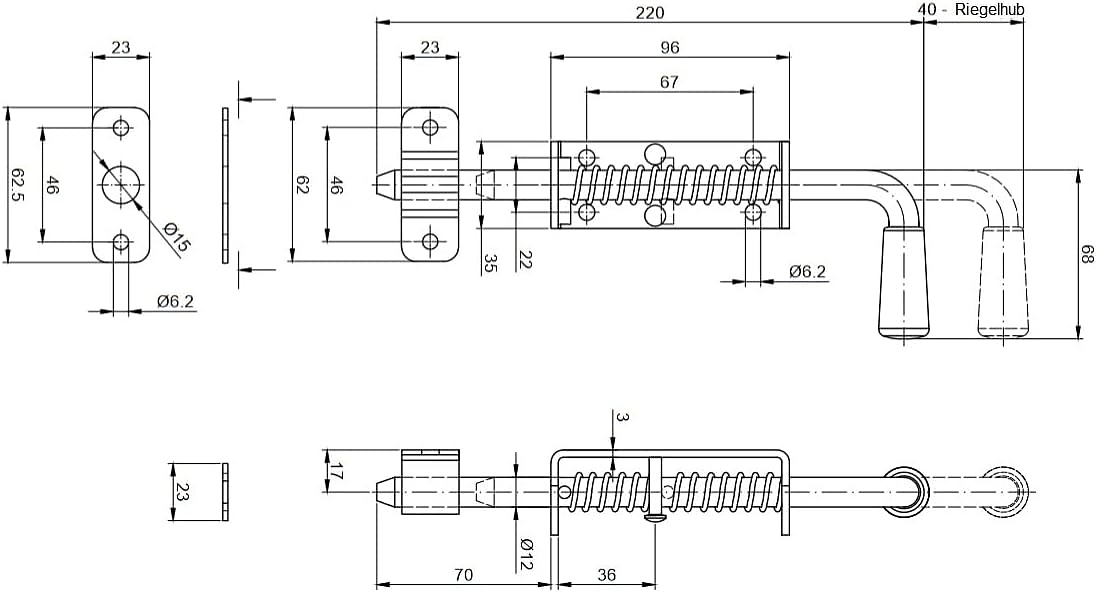 Пружинно резе: пружинното резе е изработено от поцинкована стомана и следователно е много устойчив на механични повреди, атмосферни влияния и корозия, което го прави издръжлив. Неговата здрава конструкция предпазва портата, вратата или стълба от счупване. Резето може да се монтира на метални и дървени врати. Продуктът е подходящ за вътрешна и външна употреба. Оптимално оформената гумена дръжка улеснява ежедневната употреба.