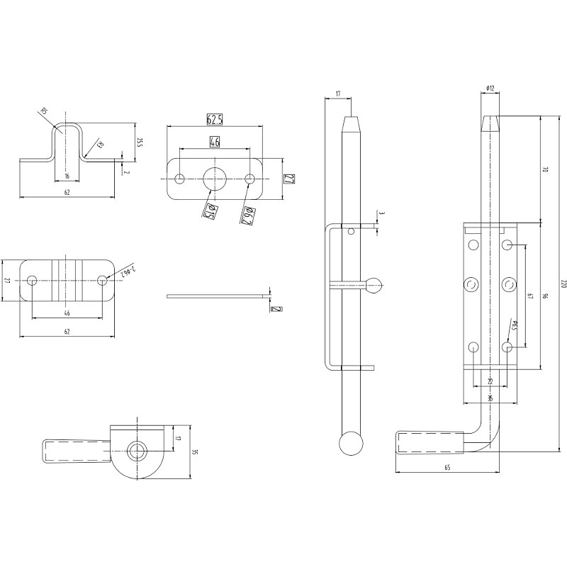 - Размери: дължина на болта 220 мм; диаметър на болта 12 мм; ширина на основата 35 мм; дължина на основата 96 мм; дебелина на основния лист 3 мм; 4 монтажни отвора, диаметър 6,2 мм; ход на болта 42 мм; минимална ширина на профила 40 мм