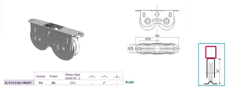 Ролка долна двойна за плъзгащ портал - D80mm H97mm 600кг